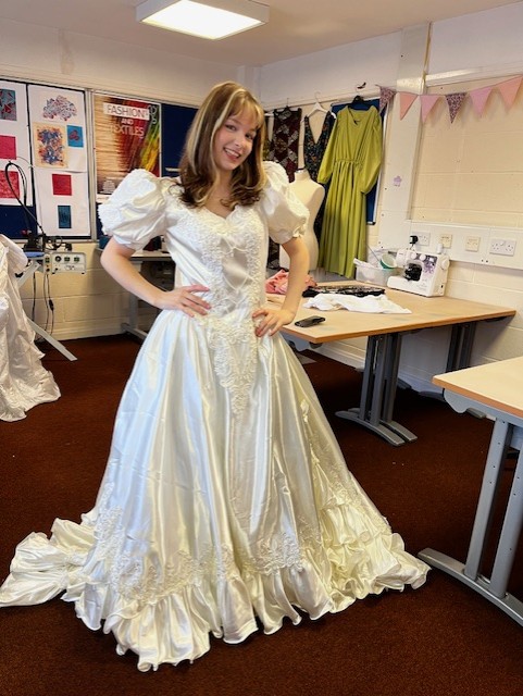 The dresses, generously donated to Highland Hospice, span decades of changing fashion, from post-war elegance to 1980s grandeur and contemporary minimalism. While each gown reflects the style of its era, it also holds something far more personal: the memory of a wedding day, a family story or a life milestone. Students researched the social and cultural context of each garment, exploring how attitudes towards marriage, gender roles, economy and celebration have evolved over time.