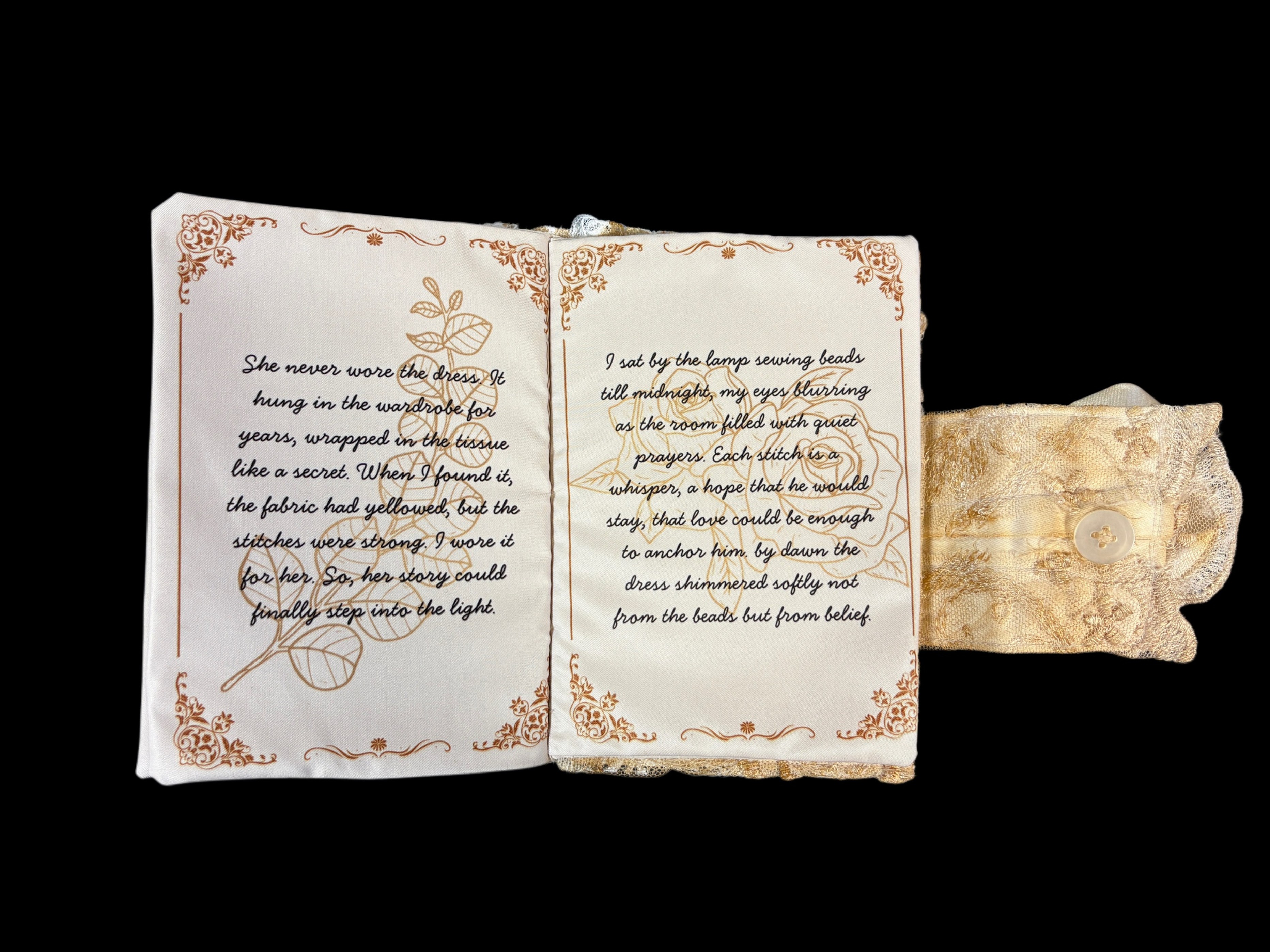 A closed textile book by Oliwia Palicka, featuring a cover crafted from intricate cream lace and adorned with a large, handmade satin fabric rose.Three people in bridal attire pose against a dark background: one seated in a large tulle gown with red roses, another in a short satin dress with white roses, and a third in a lace gown with a floral crown.A handmade memory bunny soft toy crafted from various white lace and patterned fabrics, featuring black button eyes, satin bow ears, and a small pink collar, set against a pink background.An ivory vintage-style wedding dress with large puffed sleeves, intricate lace embroidery on the bodice and waist, and a voluminous tiered ruffled skirt, hanging on a clothing rack.A person with pink-toned hair wearing a long-sleeved, floor-length indigo ombré dress with a floral pattern, standing in a classroom or workshop setting.An open textile book titled Woven Memories, featuring printed cursive text and gold floral illustrations on fabric pages with lace and button detailing.